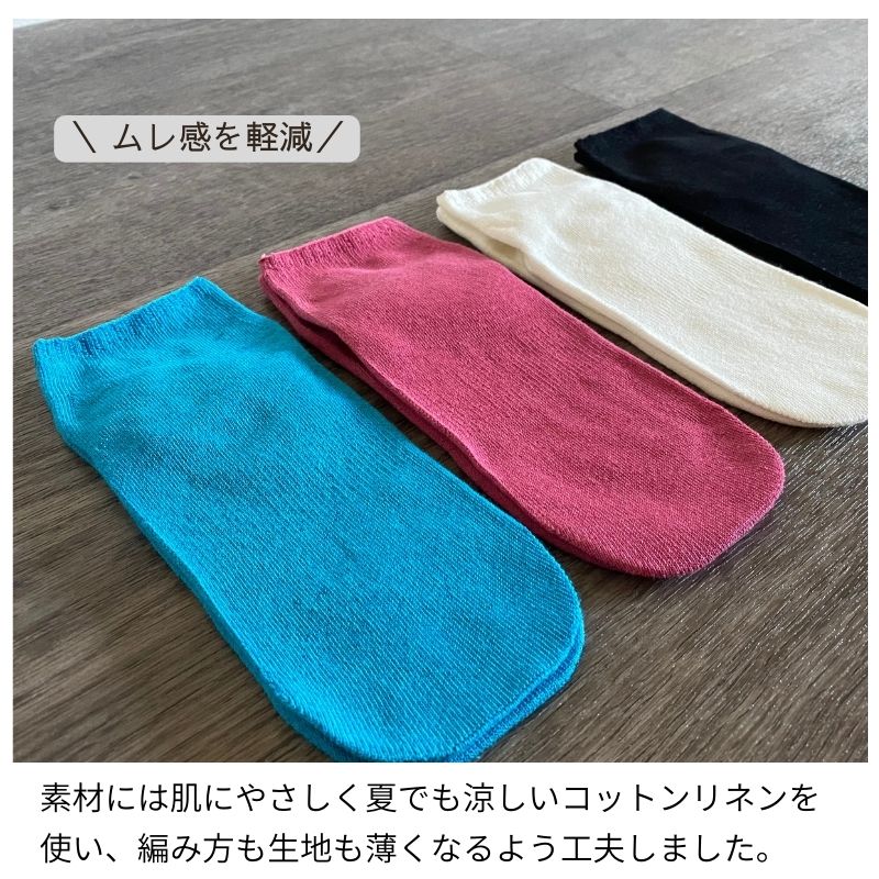 シームレスソックス ショート 日本製 コットンリネン 黒 白 ピンク ブルー くるぶし アンクル 夏用 涼しい 履き口 ゆったり つま先 縫い目なし 痛くない